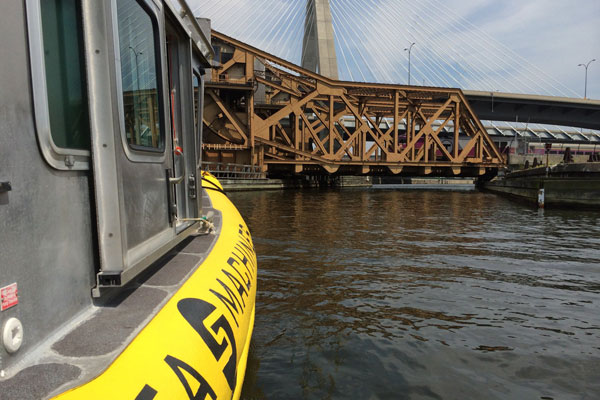 Sea Machines brought the test vessel STEADFAST into the Charles River on Wednesday for presentation and demonstration at MIT’s MOOS-DAWG Conference. The STEADFAST was by many orders of magnitude the largest and most powerful autonomous vessel or machine at the event and she was demonstrated alongside other great AUV & USV technology from MIT, Bluefin Robotics, Riptide, Boston Dynamics, Ocean Server, AMS, and more. Each team received 15 mins of demo time and the Sea Machines’ STEADFAST was remote operated from the dockside user interface with data comms over a 5ghz radio link, running a some waypoints and a survey grid while collecting side scan imagery of the river bottom.
